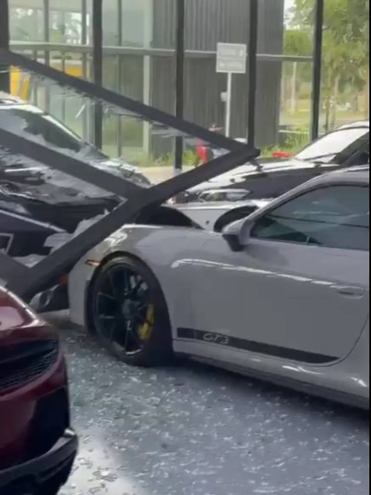 Mobil Porsche yang ditabrak mengalami kerusakan pada bagian depannya terlihat cukup parah. Selain itu suara dari alarm keamanan mobil pun terus berbunyi