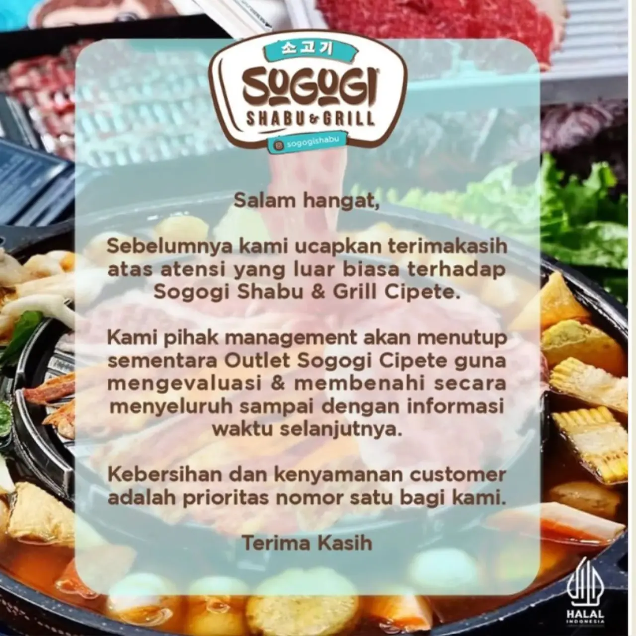 "Kami pihak management akan menutup sementara Sogogi Cipete guna mengevaluasi dan membenahi secara menyeluruh. Penutupan akan dilakukan sampai dengan informasi waktu selanjutnya Kebersihan dan kenyamanan customer adalah prioritas nomor satu bagi kami. Terima kasih,” tulis pihak restoran di Instagram.